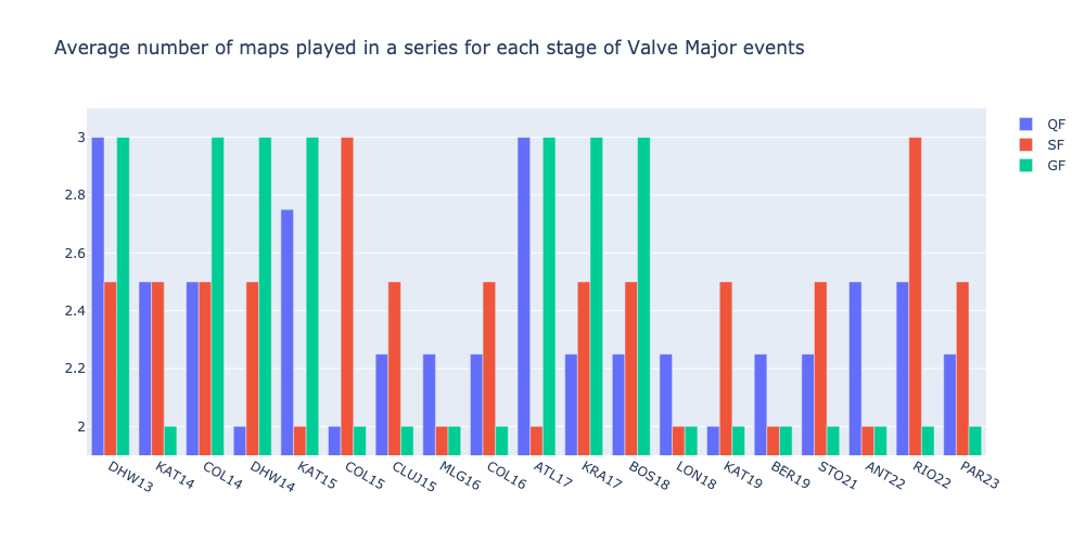 Averaging the majors before 2018, and the majors after 2020 (so as to exclude the worst majors), and splitting it by stage, we can see the problem. As mentioned earlier in the article, the right way for a Major to trend is for each stage to be more competitive. Before 2018, this was the average. But after 2020 (and 2018, for that matter), this does not happen. The Grand Finals of now are even less competitive than the quarter-finals of before.