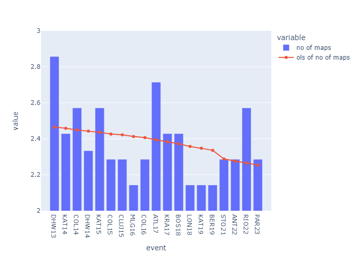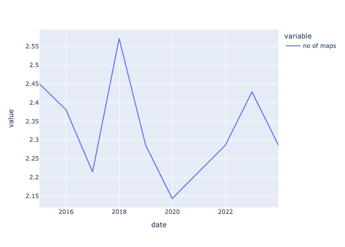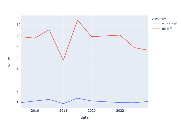 | The Yearly Average of the number of maps played at play-off stages of Valve Major Events | The Yearly Average of the kill differential and round differential played at play-off stages of Valve Major Events |